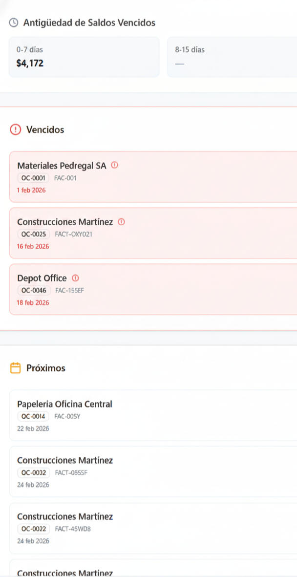 Visualiza tu deuda total, próximos vencimientos y antigüedad de saldos en un dashboard intuitivo con métricas accionables.