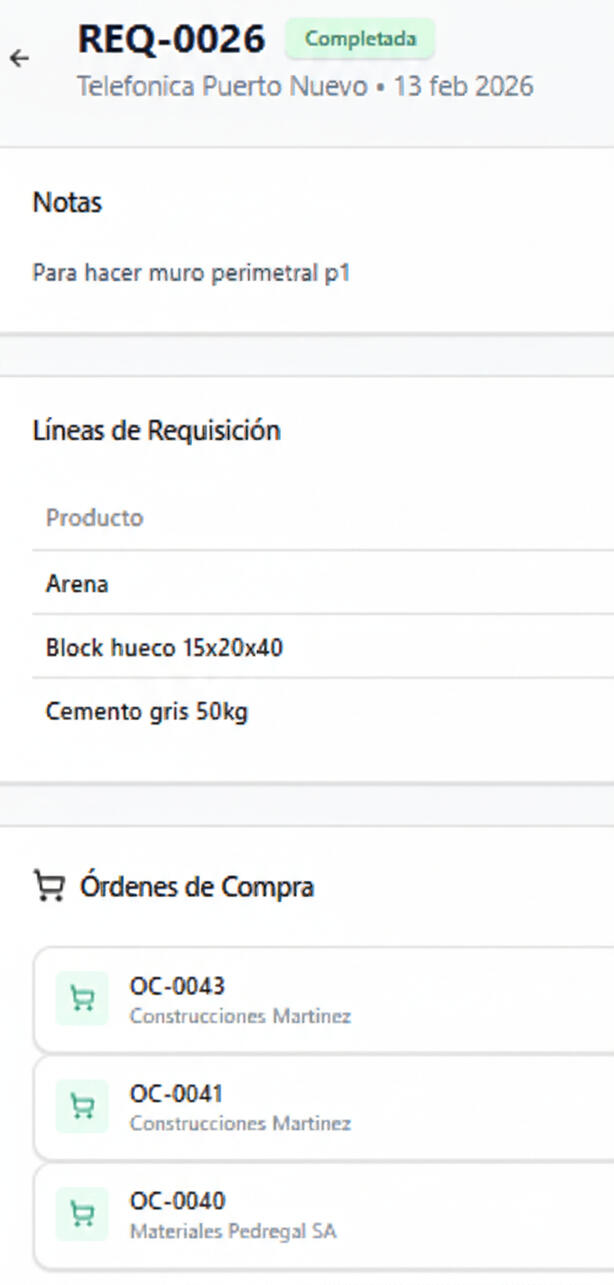 Genera Requisiciones y Órdenes de Compra (OC) vinculadas a folios y proyectos específicos para asegurar que cada peso tenga trazabilidad.
